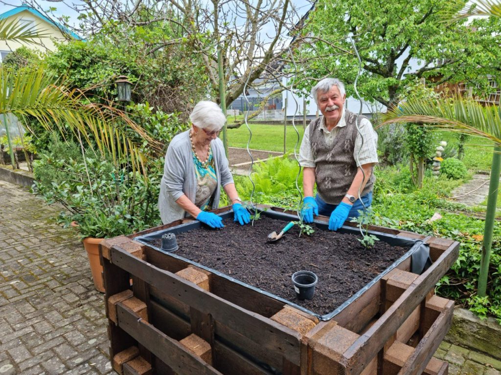 Am 6.5.22 wurde unser neues Hochbeet eingeweiht. Aus alten Holzpaletten wurde dieses Beet in Eigenarbeit angelegt. So können die Tagesgäste und Bewohner/Innen vom Haus Sonnenschein im Stehen mühelos Gemüse anpflanzen bzw. hoffentlich auch bald ernten.
